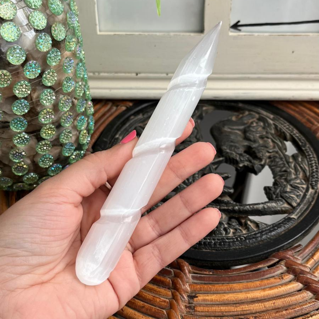 Consejo de uso: Las personas que sufren de migrañas o dolores de cabeza pueden pasarse suavemente la selenita por las sienes para aliviar el malestar y promover la relajación profunda.