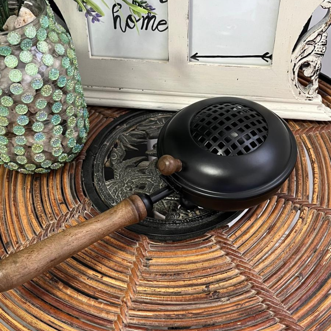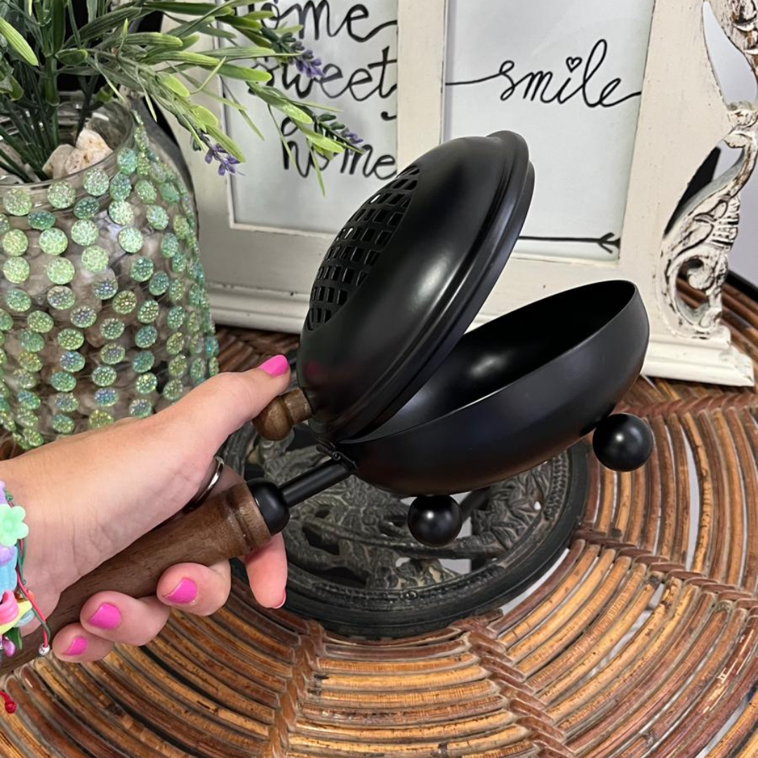 Potencia tus rituales de protección con el Brasero de Bruja Negro. Este brasero de metal resistente con acabado negro es la herramienta perfecta para alejar energías negativas, limpiezas profundas y rituales de protección espiritual. Su diseño místico y funcional permite quemar inciensos protectores, hierbas sagradas, bombitas y resinas purificadoras con máxima eficacia.