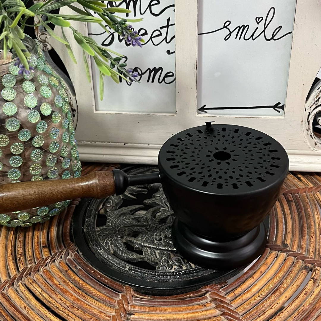 Potencia tus rituales de protección con el Brasero Metal Negro. Este elegante brasero de metal negro es perfecto para alejar influencias negativas, energías no deseadas y entidades no físicas de cualquier espacio, persona o situación. Su diseño sobrio y poderoso permite quemar inciensos protectores, hierbas de protección, bombitas y resinas purificadoras con máxima eficacia. Ideal para protección espiritual, rituales de luna nueva, limpieza profunda y creación de espacios seguros.