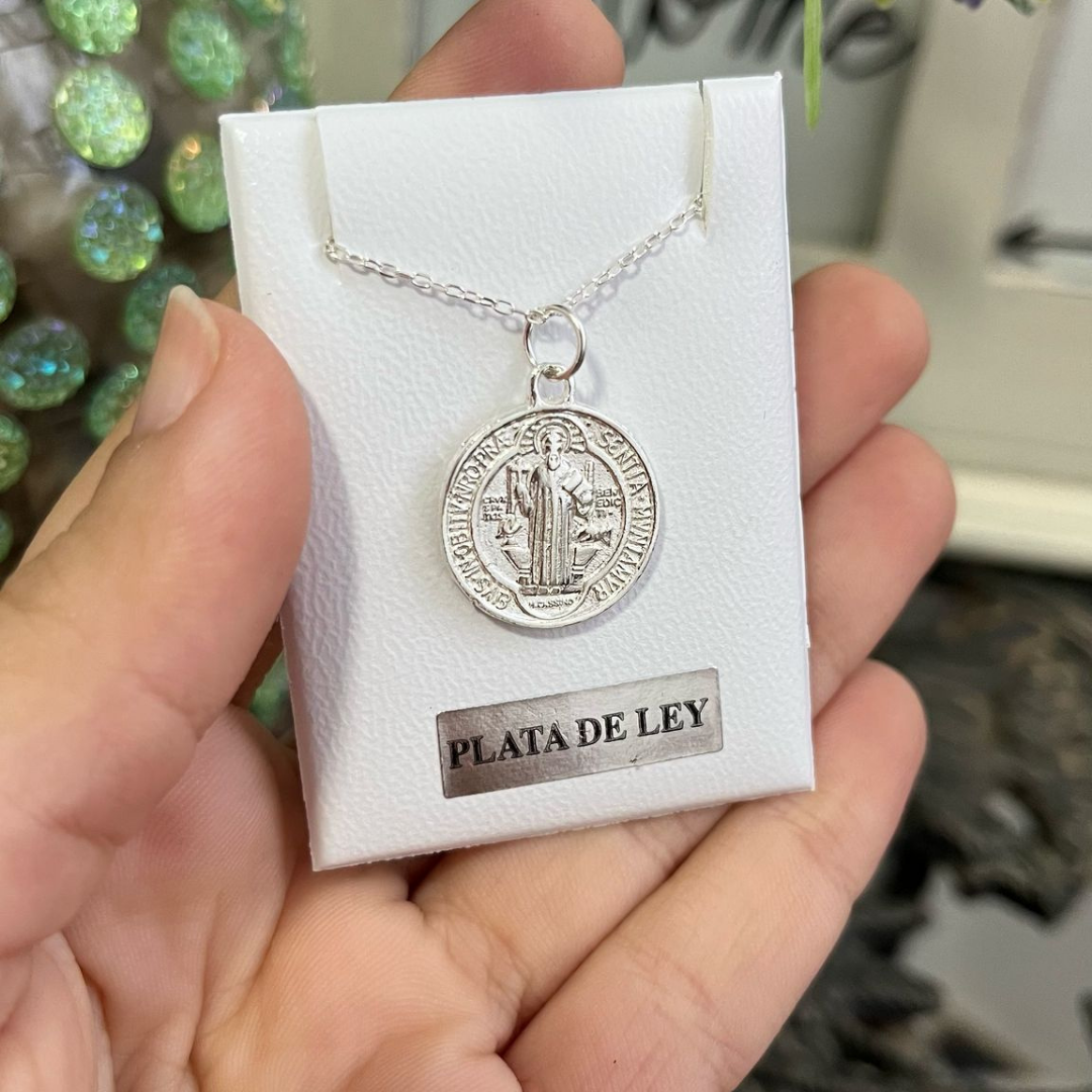 El Collar Medalla San Benito Mediana (Plata) te protege de todo lo malo que te pueda pasar. San Benito es el santo más poderoso contra brujerías , maleficios , malas energías y personas que te quieren hacer daño . Te ayuda cuando sientes que alguien te está haciendo brujería , cuando tienes mala suerte constante , accidentes frecuentes o cuando todo te sale mal . También te protege de tentaciones , vicios y malas decisiones . Te da fuerza para resistir el mal y mantener la fe en momentos difíciles. La medalla mediana es perfecta para uso diario, ni muy grande ni muy pequeña. Ideal para personas que necesitan protección fuerte contra el mal y quieren sentirse seguros espiritualmente.