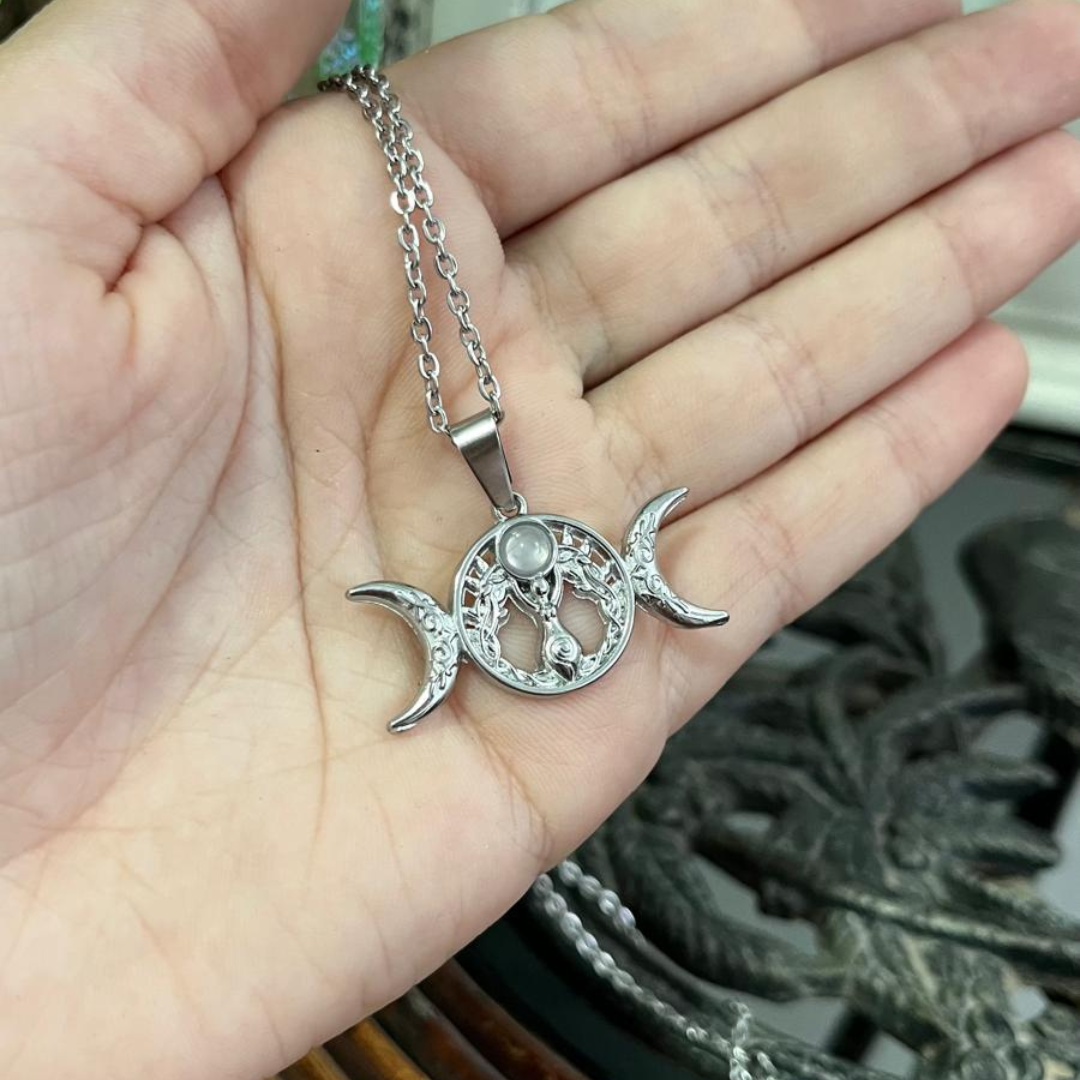 Collar Triple Luna Cuarzo Rosa Acero (Diosa Wicca Fertilidad)