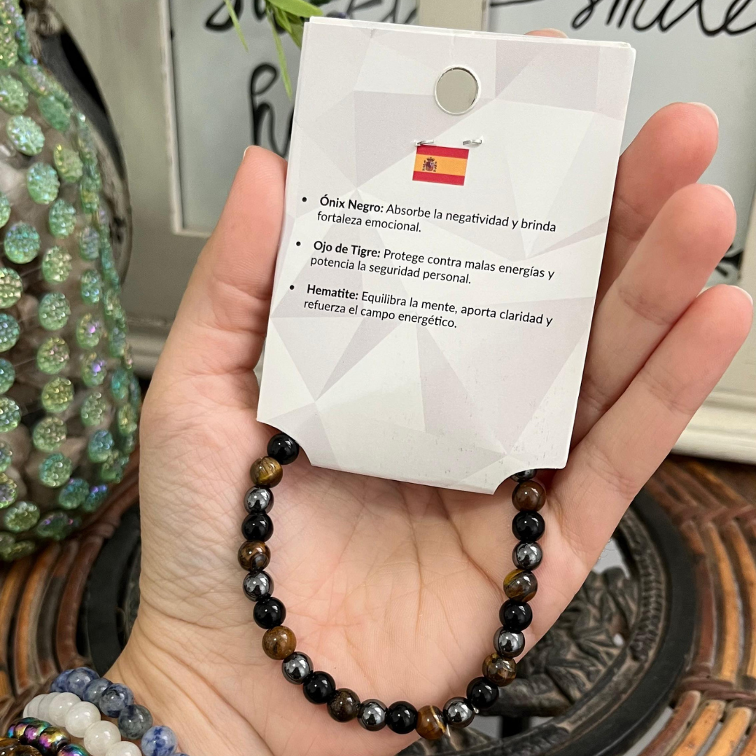La Pulsera Triple Protección es tu aliada para protección completa y defensa energética. Te ayuda a alejar energías negativas, protegerte de envidias, crear escudo protector y mantener tu aura limpia. Esta pulsera combina tres piedras protectoras cuidadosamente seleccionadas por sus propiedades defensivas, creando una barrera energética triple que te protege en todos los niveles. Cada cristal aporta su poder protector único, trabajando en sinergia para neutralizar ataques psíquicos y mantener tu energía estable.