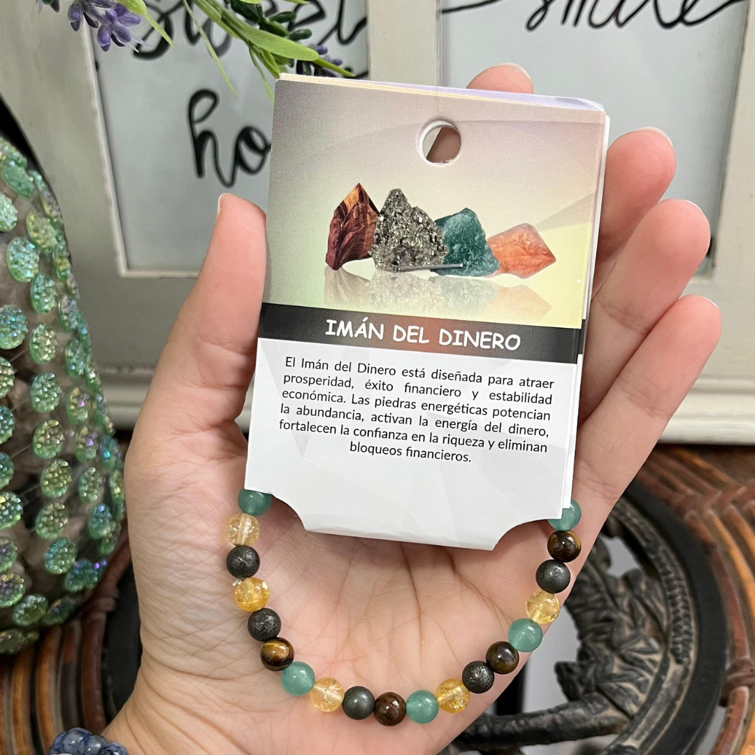 La Pulsera Imán del Dinero es tu aliada para atraer abundancia y magnetizar prosperidad. Combina aventurina verde, citrino, pirita y ojo de tigre, conocidas por atraer la abundancia y la prosperidad. Esta pulsera es ideal para aquellos que buscan atraer la buena suerte y la riqueza a sus vidas.