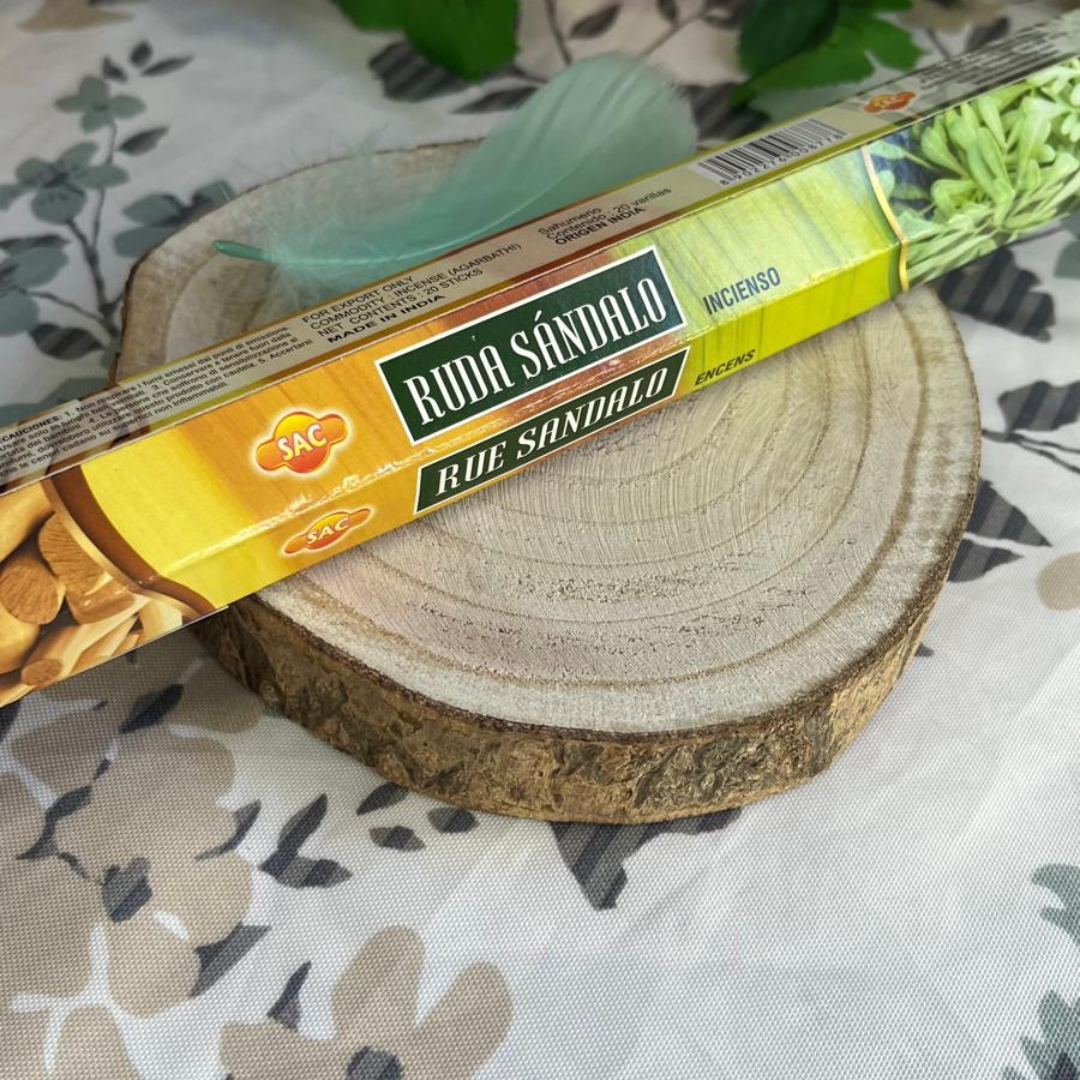 El Incienso Sac Ruda Sándalo es tu aliado para protección y paz espiritual. Te ayuda a alejar energías negativas, protección contra envidias, mal de ojo y calmar la mente. Su combinación de ruda protectora y sándalo relajante crea equilibrio perfecto. Quémalo en tu hogar, oficina, durante meditaciones o cuando necesites protección y tranquilidad.