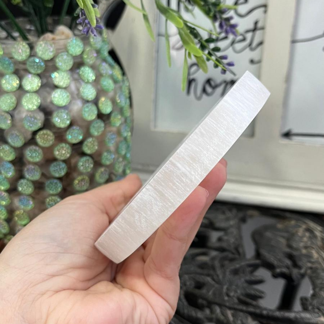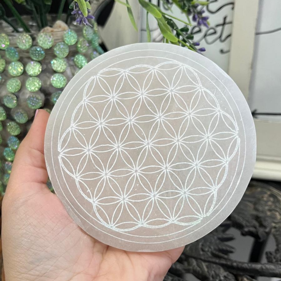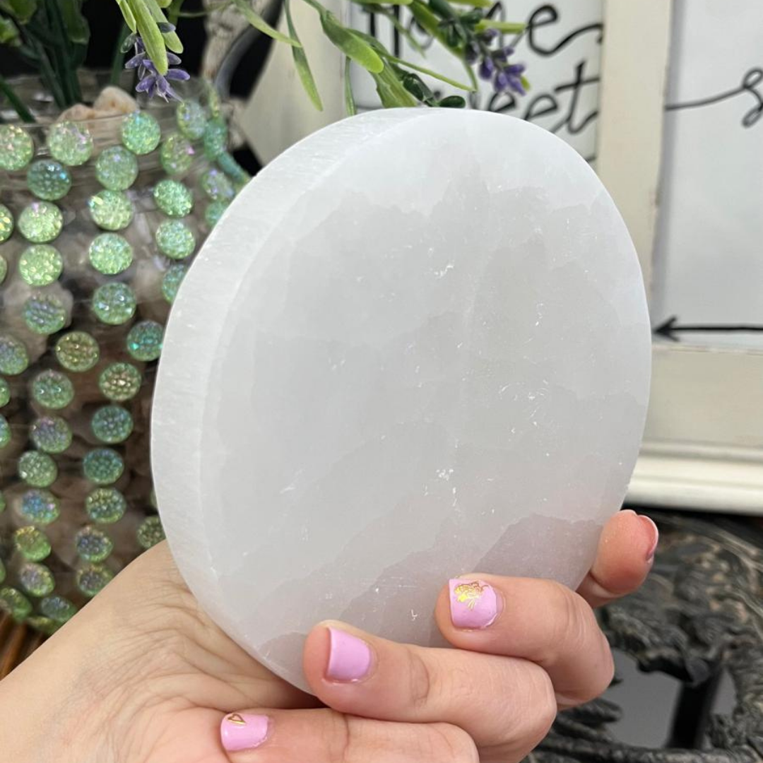 Modo de uso: Coloca tus minerales y amuletos sobre la placa durante 4-6 horas para limpiarlos y recargarlos, úsala en tu altar para purificar el espacio o colócala en tu hogar para equilibrar las energías.