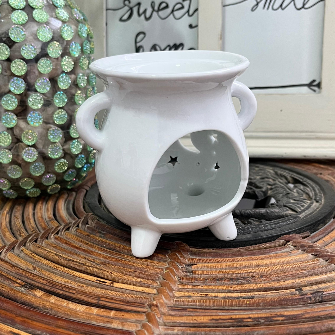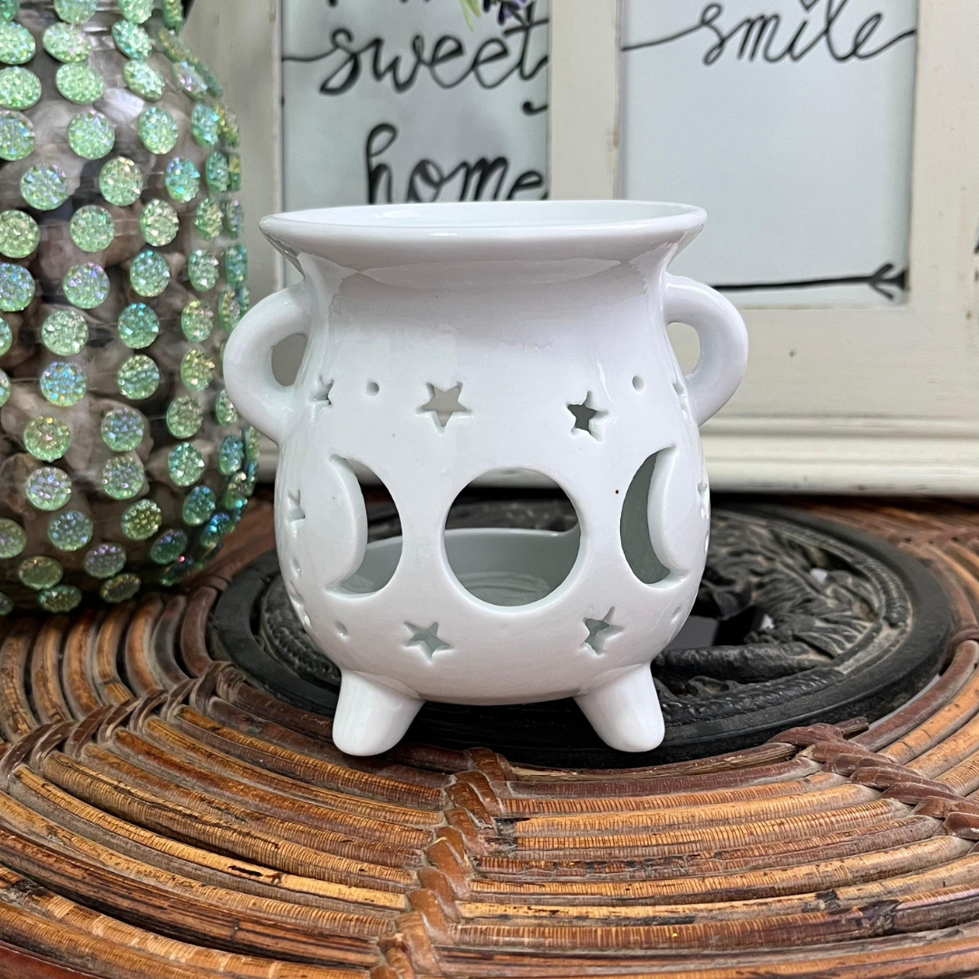 El Quemador Cerámica Triple Luna , con forma de caldero de bruja , te ayuda a crear ambientes místicos . La triple luna simboliza doncella, madre y anciana , representando el ciclo completo de la vida y la sabiduría femenina . Perfecto para quemar velitas de té , aceites aromáticos y ceras aromáticas (Wax melts).