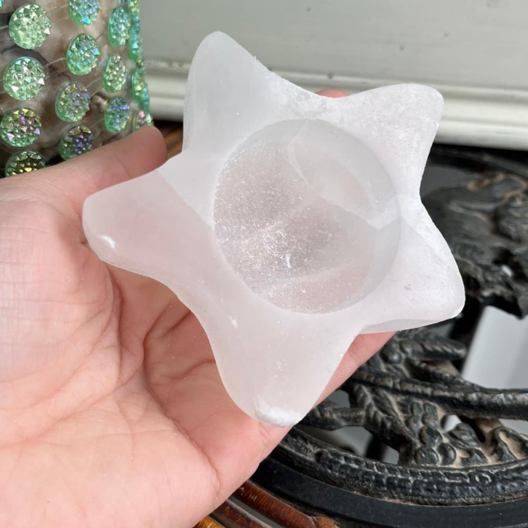 Ritual de purificación: Coloca tu vela favorita sobre la estrella de selenita, enciéndela un domingo por la noche, visualiza luz blanca expandiéndose por todo el espacio y repite "mi espacio se purifica y mis intenciones se amplifican".