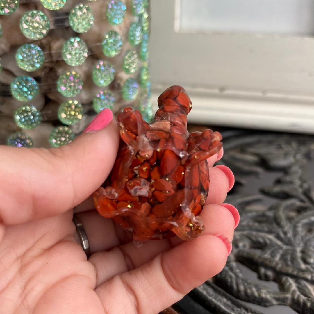 La Tortuga Fuerza es tu aliada para fortaleza interior y poder personal. Te ayuda a superar obstáculos, aumentar determinación y desarrollar coraje, cuando necesitas resistencia y valentía. Gracias al jaspe rojo y dorado fortalece tu espíritu, aporta vitalidad y abundancia. Su energía de tortuga sabia combina fuerza con prosperidad. Colócala en tu oficina, área de trabajo o espacio personal.