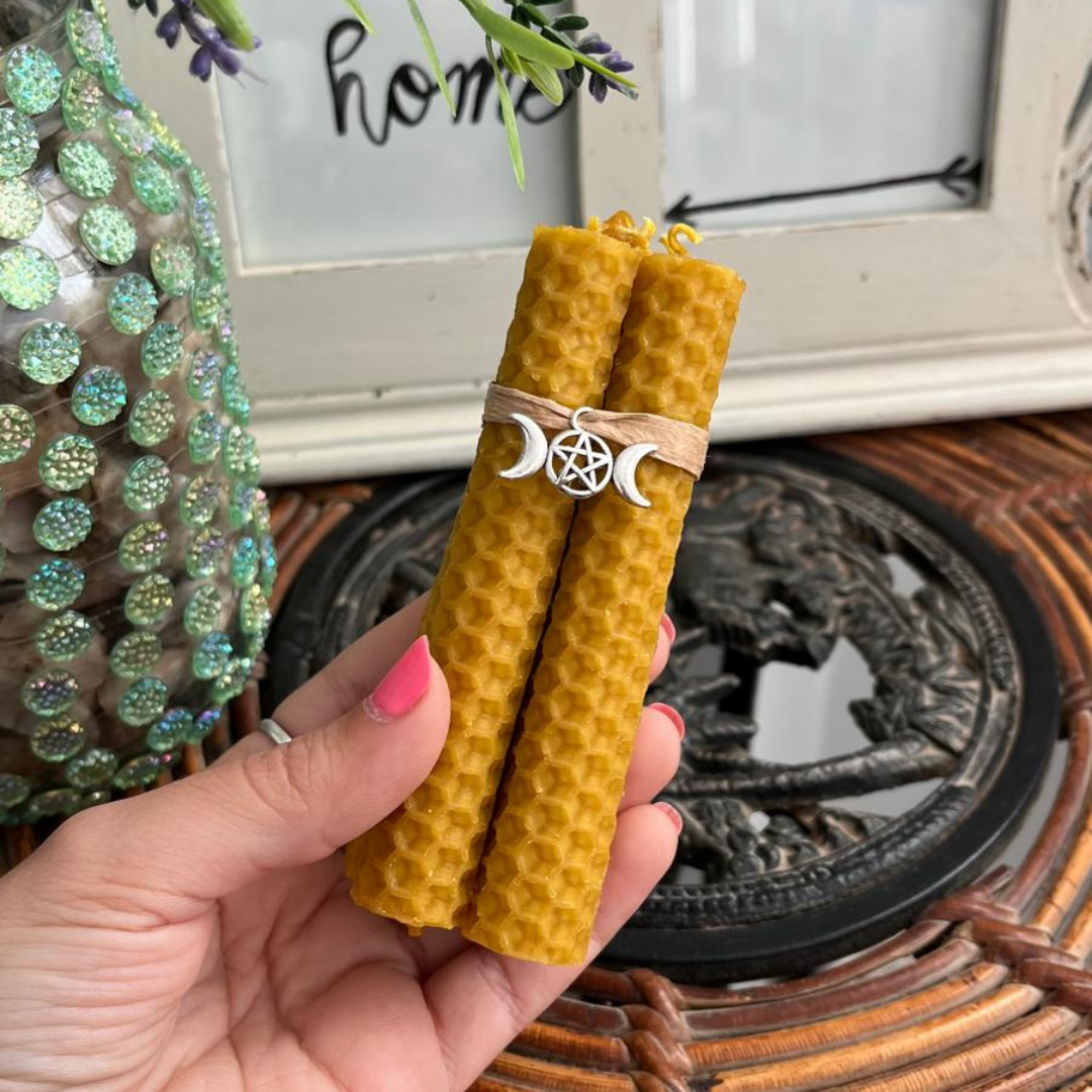 Las Velas de Miel con Colgante de Triple Luna te ayudan a conectar con tu intuición y potenciar tu energía femenina cuando necesitas claridad mental y sabiduría. Enciéndelas durante la luna llena, rituales de manifestación. Su miel natural endulza tus intenciones y el colgante de triple luna amplifica tu poder femenino y conexión espiritual.